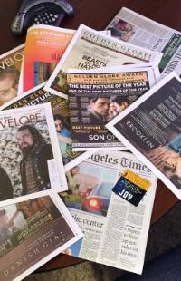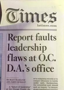 The luckiest press officer today works at the Orange County DA’s office. That’s because every day for the past few weeks, our daily newspapers are wrapped in pages and pages of advertisements for the upcoming Golden Globes, Academy Awards and other entertainment accolades. Sometimes, there are also stickers on the front page of the paper. Today's LA Times has one for the movie 'Joy' covering the headline for the lead story, “Report faults leadership flaws at OC D.A.’s office.” You have to carefully peel off the promotional decal to see what’s underneath, and if you’re like most of us, the newspaper sits on the table all day with the sticker still covering up the bad news. If the folks in the District Attorney’s office weren’t Jennifer Lawrence fans before, they probably are now. |