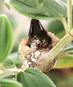For the past couple of weeks, we've been watching this hummingbird nest outside our window. Two eggs and a protective mama bird.